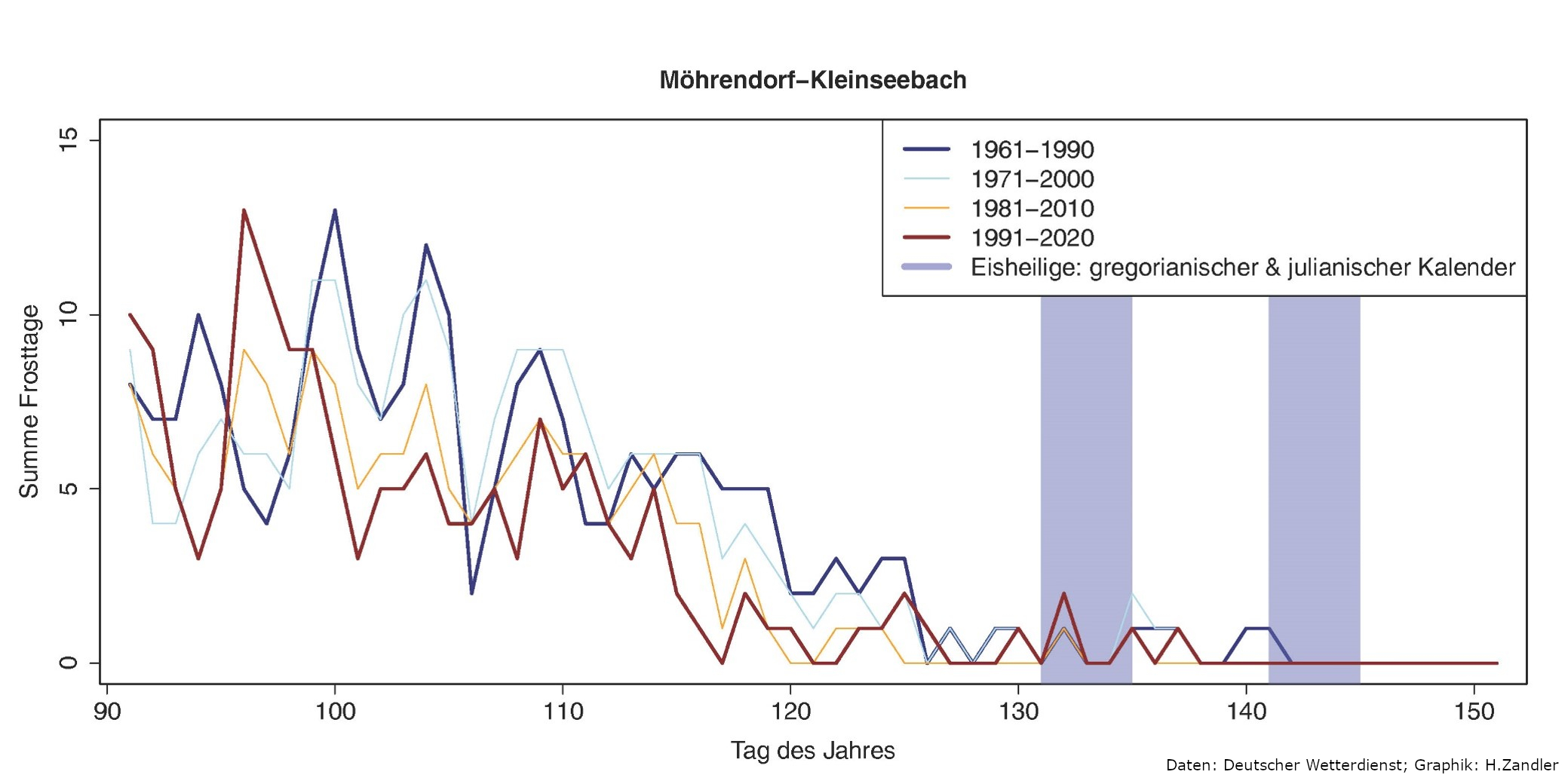 Erste Analysen für den Landkreis zeigen, dass auch im Zeitabschnitt 1991-2020 bis Mitte Mai Fröste auftreten können, auch wenn die wenn die Zahl der Forsttage im April/Mai von etwa neun Tagen auf ca. fünf Tage abnimmt (Abbildung 5).